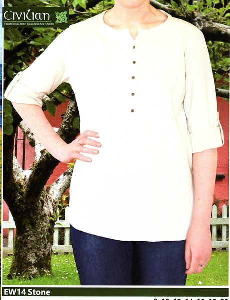 This long sleeve line grandfather collar shirt comes in a choice of colors, has rollback sleeves and is light, cool and comfortable to wear. A half length placket and ruched shouldrs give it a feminine and comfortable feel.